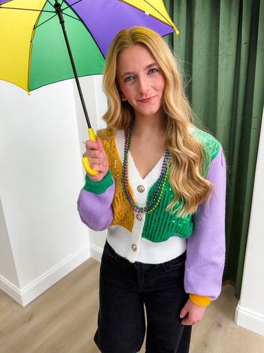 Dance through the season in style! This festive cardigan brings the Mardi Gras spirit to any outfit. Features: Cozy, comfortable fit perfect for l...