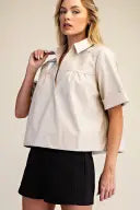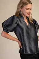 Solid satin short puff sleeve top with front hidden hook and eye closure detail. Lining. 84% RAYON 10% POLYESTER 6% NYLON